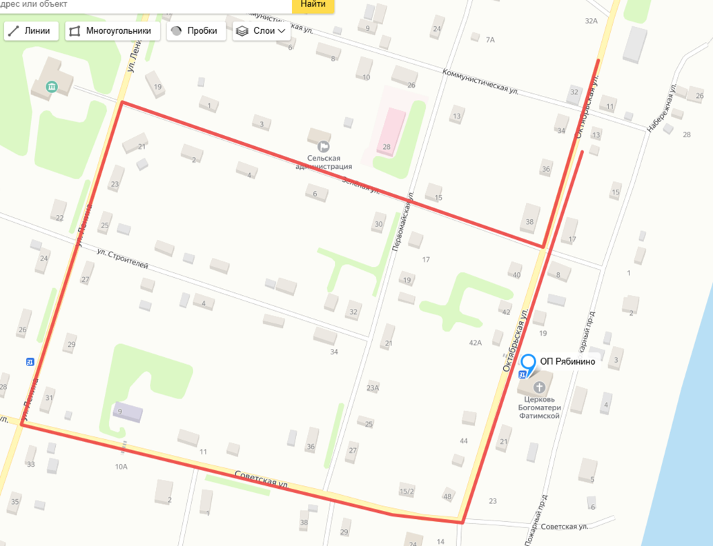 по п. Рябинино. Автобус следует по ул. Октябрьская ул. Зеленая, ул. Ленина, ул. Советская, ул. Октябрьская и далее по маршруту.